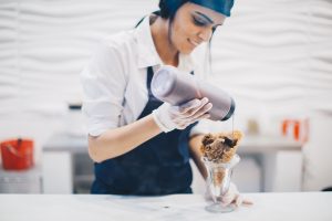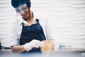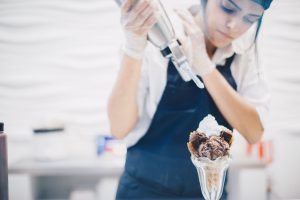 When she was 10 her family moved to Toronto, Ontario. Her first few work experiences this side of the globe set the stage for her current endeavor. She, like many teenagers, had her first job scooping up sundaes at Baskin-Robbins. “I used to come home and make all these sundaes. [I would say] ‘Mom, I’m gonna make you a brownie Sundae’. I guess it was foreshadowing!” It made such an impression, she can still recall her favorite flavor. “Jamoca Almond Fudge ice cream — it has almonds in there, a swirl of chocolate, nutty and caramely. I don’t drink coffee, but it’s such a good flavor!”