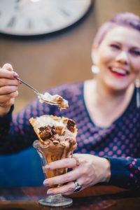 I had to sample Alisha’s favorite flavor, the Proper Chocolate, which is a dark chocolate ice cream with chunks of brownie bites in it. This sundae comes with a homemade waffle cone, Belgian dark chocolate sauce, and whipped cream.